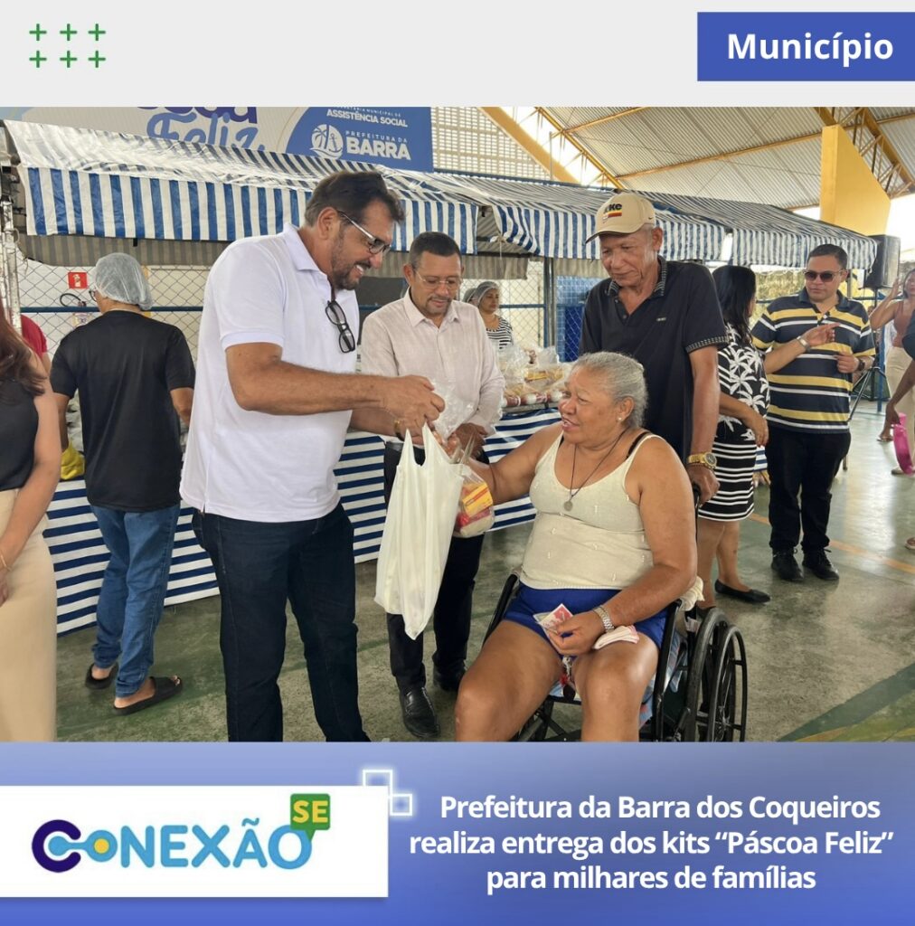 A Prefeitura da Barra dos Coqueiros realizou a entrega dos kits “Páscoa Feliz”, beneficiando milhares de famílias do município inscritas no Cadastro Único (CadÚnico) e que realizaram o cadastramento prévio. Ao todo, foram distribuídos 3 mil kits, contendo peixe, mantimentos e caixa de chocolate.